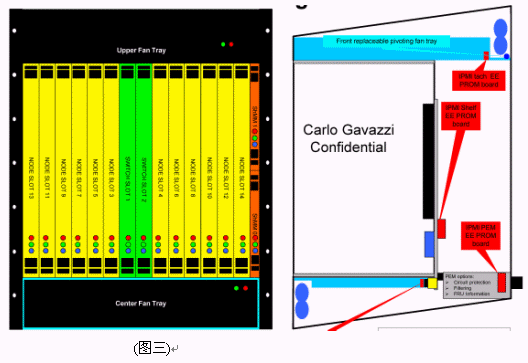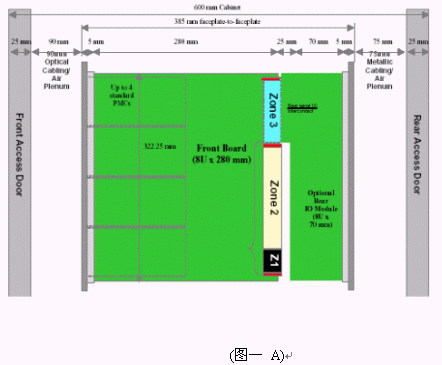 我們可以看到當(dāng)今市面上已有相關(guān)的零件商或系統(tǒng)商開(kāi)發(fā)出14U或13U,12U的ATCA機(jī)箱。就ATCA機(jī)箱的型式來(lái)說(shuō)可以分為直立型插卡與橫向型插卡兩種類(lèi)型。直立式插卡機(jī)箱的標(biāo)準(zhǔn)為14槽(參考圖一B),而橫向型機(jī)箱因受限于機(jī)箱高度,所以視其高度決定槽數(shù)的多少。 ATCA的架構(gòu)主要包括以下部分:正面插槽,RTM,PEM,背板,CMMs,散熱系統(tǒng)。(參考圖一與圖二)