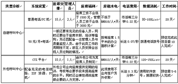 以上是以Telemarkering項目舉例,如需完成一萬條數(shù)據的外呼工作,自建呼叫中心與外包型呼叫中心的區(qū)別。以上數(shù)字只是提現(xiàn)在設備、人員效率等方面問題,另定期的人員培訓及相關系統(tǒng)的維護將是費用產生的一大因素。其實在項目的實施過程中發(fā)生的費用只是一部分,從公司的運營角度看是可以節(jié)省很大的精力(例如:人員招聘、培訓、福利待遇)及運營時間。