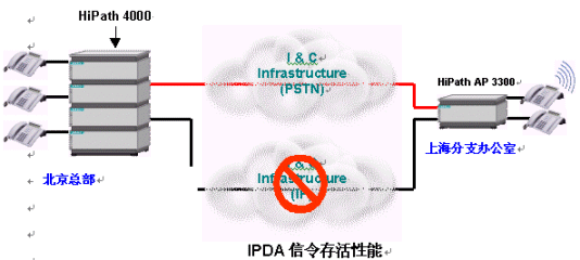 人們也許會(huì)問,IP語音(VoIP)是否足夠可靠?如果IP網(wǎng)絡(luò)上的信令通道出現(xiàn)故障,HiPath平臺(tái)仍將保證對(duì)各接入點(diǎn)的控制,從而提供了可靠的信令存活性能(Signaling Survivability)。在下面的圖例中,當(dāng)企業(yè)IP網(wǎng)絡(luò)出現(xiàn)某些問題后,信令通道轉(zhuǎn)移到了公共交換電話網(wǎng)絡(luò)(PSTN)之上。