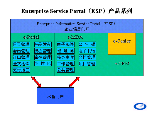 ESP 產(chǎn)品系列關系如下圖所示,EISP 是瑞尊公司所有應用軟件的前端統(tǒng)一界面,e-Portal 、e-MBAe-CRM 為在EISP 平臺下運行的具體應用系統(tǒng),e-Portale-MBA 兩個產(chǎn)品合二為一構成了針對中小企業(yè)的普及型產(chǎn)品�水晶門戶。