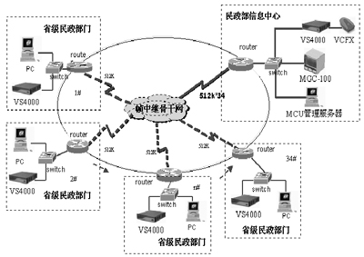 系統(tǒng)骨干網(wǎng)絡為民政廣域網(wǎng),該網(wǎng)提供512Kbps帶寬(幀中繼)的傳輸信道。整個系統(tǒng)以北京總部為中心,覆蓋全國37個省、自治區(qū)、直轄市以及計劃單列市的民政部門,成為電子政務標志性工程——“數(shù)字民政”的一個重要組成部分。