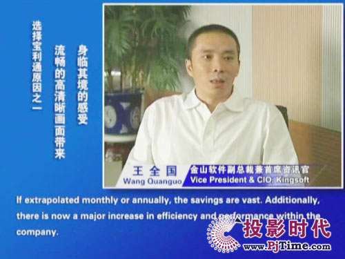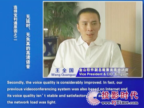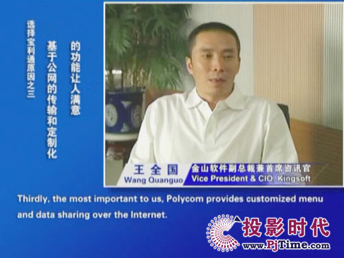 金山軟件副總裁兼首席資訊官王全國先生說道:“對于軟件行業(yè)來說,及時、高效的溝通是保持競爭優(yōu)勢的重要前提。相比之前使用的標清產(chǎn)品,寶利通高清視頻會議系統(tǒng),提供了完全不同的體驗,流暢的高清晰畫面猶如真實的面對面溝通。而且我們公司并沒有申請專線,所有的應用都是基于公網(wǎng)實現(xiàn)的。另一方面,新型全中文定制菜單的運用,令我們使用起來非常方便,這更提高了我們使用視頻通信手段實現(xiàn)異地溝通的熱情!