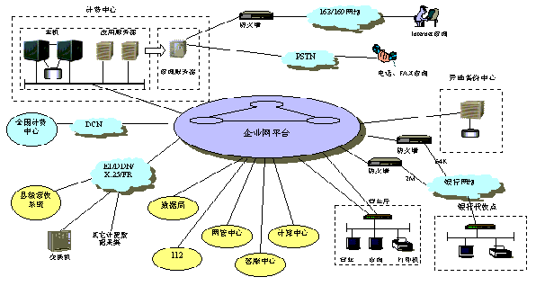 縣計(jì)費(fèi)中心采用64K DDN連接各營(yíng)業(yè)廳和支局,縣銀行通過(guò)銀行網(wǎng)絡(luò)連入企業(yè)網(wǎng)平臺(tái),鄉(xiāng)鎮(zhèn)代收點(diǎn)視具體條件的不同可采用DDN、ISDN或PSTN方式連入計(jì)費(fèi)中心。