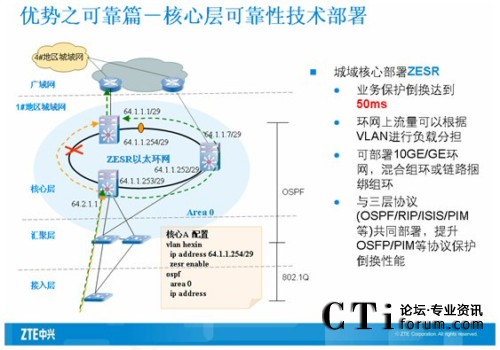 核心交換機(jī)主要是匯聚下行的全千兆智能路由交換機(jī),所以要求設(shè)備提供高密度板卡和線速轉(zhuǎn)發(fā)的能力。同時保證對下行端口進(jìn)行帶寬控制,中興采用萬兆路由交換機(jī)ZXR10 8905來滿足用戶的需求。ZXR10 8900系列萬兆路由交換機(jī)是中興通訊推出的新一代的大容量核心/匯聚路由交換機(jī)系列產(chǎn)品,主要定位于運(yùn)營商IP城域網(wǎng)、校園網(wǎng)、電子政務(wù)網(wǎng)和大型企事業(yè)網(wǎng)等網(wǎng)絡(luò)的核心/匯聚層。ZXR10 8900系列萬兆路由交換機(jī)基于先進(jìn)的模塊化理念進(jìn)行設(shè)計,并采用了基于多處理器并行處理機(jī)制和Crossbar空分交換結(jié)構(gòu)的體系結(jié)構(gòu),關(guān)鍵模塊均采用可以1:1進(jìn)行冗余備份。ZXR10 8900系列具備10GE、GE、FE等各種豐富的接口模塊,并全面支持IPv4、IPv6、組播、QOS、帶寬控制等業(yè)務(wù)功能。ZXR10 8900系列整個系統(tǒng)所具備的高可靠性、高擴(kuò)展性、良好的業(yè)務(wù)能力等特點(diǎn),可以滿足各種網(wǎng)絡(luò)核心/匯聚層的建設(shè)需求。