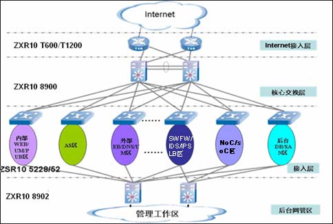 寬帶數(shù)據(jù)承載網(wǎng)主要考慮的是保證網(wǎng)絡的高可靠性(整體網(wǎng)絡結(jié)構(gòu)全冗余和設備的全冗余配置)、高可擴展性(核心交換設備具有大容量特性和網(wǎng)絡結(jié)構(gòu)的易于拓展)、分層網(wǎng)絡結(jié)構(gòu)和高可用性。中興的解決方案中,整個網(wǎng)絡分成四個部分:Internet接入層、核心交換層、接入層、后臺管理區(qū)。