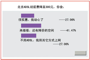 根據(jù)eNet資訊中心發(fā)起的“對北京ADSL初裝費下調(diào)持何種看法”的網(wǎng)絡(luò)調(diào)查顯示,有近三成網(wǎng)民對北京通信ADSL初裝費下調(diào)表示了歡迎。其中,占總數(shù)27.06%的網(wǎng)民表示該價格非常實惠,已經(jīng)有了安裝的想法;41.47%的網(wǎng)民持旁觀的態(tài)度,認為價格還將進一步下降。
