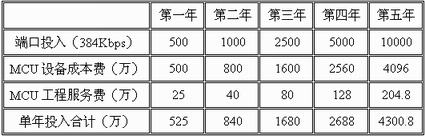 中國網(wǎng)通CNC視訊運營網(wǎng)絡在建網(wǎng)成本上主要考慮四個部分。一是視訊交換平臺MCU部分,主要用于多點視頻通信;二是視訊運營支撐系統(tǒng),包括各種運營所必須的軟件(網(wǎng)管、業(yè)務受理中心、業(yè)務管理中心)及相應的硬件服務器;三是 H.323 視訊系統(tǒng)的關鍵組件GK軟件及相應硬件服務器,其容量和個人視頻通信業(yè)務的發(fā)展情況息息相關;四是投入資金利息。具體可細分如下: