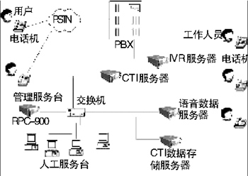 此系統(tǒng)主要由以下幾部分組成:PBX(程控交換機(jī))、IVR(交互式語音服務(wù)器)、CTI(計(jì)算機(jī)電話集成服務(wù)器)、呼叫中心監(jiān)控管理系統(tǒng)、呼叫中心數(shù)據(jù)存儲服務(wù)器、在線錄音監(jiān)聽服務(wù)器、管理服務(wù)臺(傳真服務(wù)器)、統(tǒng)一消息處理平臺和人工座席輔助系統(tǒng)。