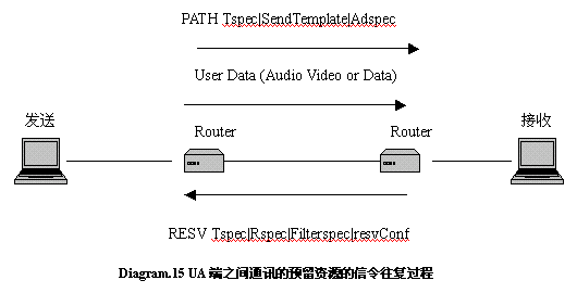 發(fā)送方發(fā)送PATH消息,消息中包含有數(shù)據(jù)業(yè)務(wù)特征,該消息沿所選的路徑傳送,沿途的路由器按照PATH準(zhǔn)備路由資源,接收方接收到PATH消息以后,根據(jù)業(yè)務(wù)特征和所需要的QOS計(jì)算出所需要的資源,回送RESV消息,消息中包含的參數(shù)就包括請(qǐng)求預(yù)留的帶寬,延PATH的原路途返回,沿途的路由器接收到RESV操作后才執(zhí)行資源預(yù)留操作。發(fā)送方接收到RESV消息以后才發(fā)送用戶數(shù)據(jù)。