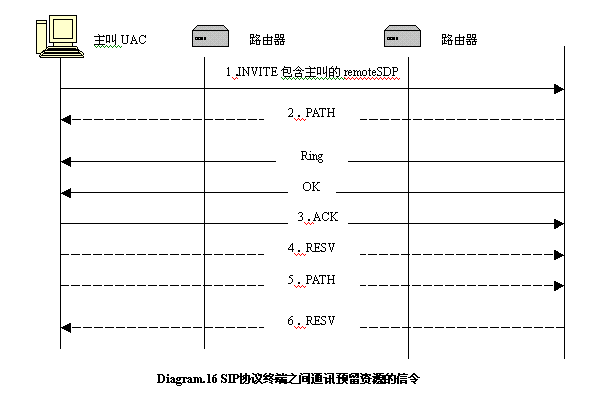 在上圖中實(shí)線的部分是SIP命令,虛線部分是RSVP消息