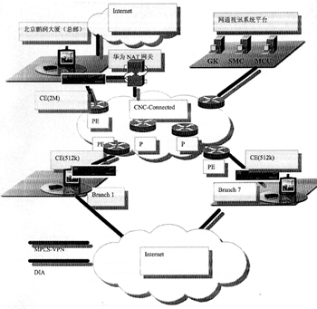 鑒于客戶是通信公司,有較強(qiáng)的系統(tǒng)管理能力,而且要求視訊和數(shù)據(jù)出口分開,視訊出口在北京,可以和VPN線路走相同的物理鏈路,不會(huì)造成路由設(shè)計(jì)上的問(wèn)題,故將NAT放在客戶公司總部,由用戶自己管理,增加DIA出口和費(fèi)用。網(wǎng)絡(luò)通信拓?fù)鋱D如右所示。
