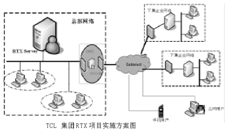 在RTX項目的實施上,TCL集團公司專門購置了一臺P4 2.4G,256M,40G的高配置服務(wù)器作為RTX Server(如圖),安裝在集團公司的總部網(wǎng)絡(luò)上,同時連接到集團公司的專線上,并分配外部IP地址,供異地員工登陸到服務(wù)器。整個RTX實施方案如圖1所示:在硬件方面,只添加一臺RTX Server作為IM服務(wù)器,無需對現(xiàn)有網(wǎng)絡(luò)作大規(guī)模改動;在軟件方面,在RTX Server上安裝最新的服務(wù)器端軟件RTX 3.2版本,使用RTX的集團員工自行下載安裝RTX客戶端,客戶端能傻瓜式在線更新。