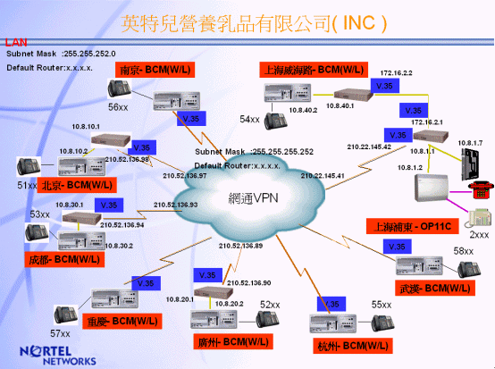 此系統(tǒng)的VPN線路由中國(guó)網(wǎng)通公司提供,INC上海浦東生產(chǎn)基地為主點(diǎn)(Nortel OP11C)系統(tǒng)通過(guò)ITG(Internet Telephone Gateway)卡和其他七個(gè)城市的分支機(jī)構(gòu)的BCM相連接,系統(tǒng)結(jié)構(gòu)圖如下: