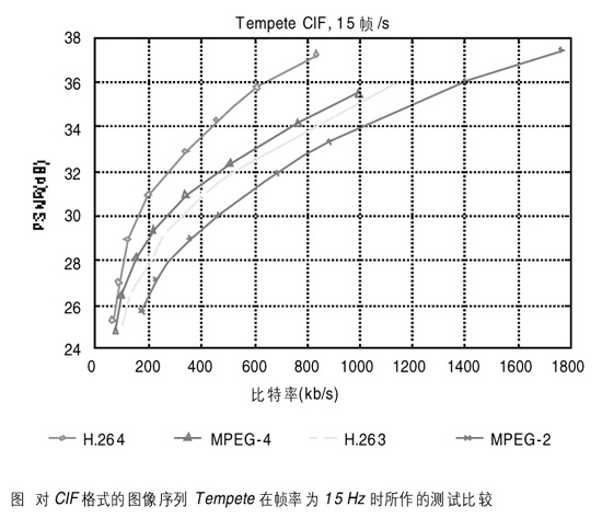 為了闡述H.264的編碼效率,我們將其與其它標(biāo)準(zhǔn)如MPEG-2、H.263、MPEG-4等作比較。使用QCIF、CIF格式的圖像序列作測(cè)試,所有編碼器都使用拉格朗日優(yōu)化技術(shù)。我們使用H.264的測(cè)試軟件JM2.0并使用了Main Profile的主要技術(shù)特征。對(duì)H.263和H.264采用的參考幀數(shù)為5,只編碼圖像序列的第一幀為I幀,每2個(gè)參考幀P之間插入2個(gè)非參考幀B。使用全搜索方式進(jìn)行32×32整數(shù)范圍的運(yùn)動(dòng)估計(jì),且由預(yù)先設(shè)定的量化參數(shù)來(lái)進(jìn)行比特率的調(diào)整。圖為對(duì)CIF格式的圖像序列Tempete在幀率為15Hz時(shí)所作的測(cè)試比較。