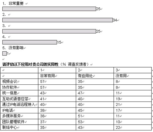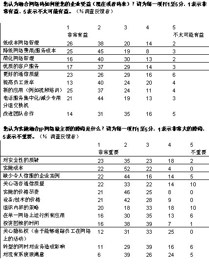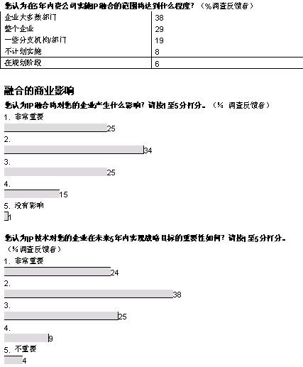 •   我們調查的企業(yè)中,有超過三分之二將在未來五年內實現(xiàn)大多數(shù)或者所有部門向融合網絡的轉型。大部分企業(yè)采取按部就班的形式在某些特殊部門和業(yè)務開始部署。在融合應用中,IP語音電話將在未來三年內吸引大量投資;管理人士期望通過大幅削減公司內部的通話費用獲得早期的回報。在更廣泛的層面上,大多數(shù)管理者預計,融合網絡對其企業(yè)的商業(yè)影響將會“非常重要”或者“重要”。