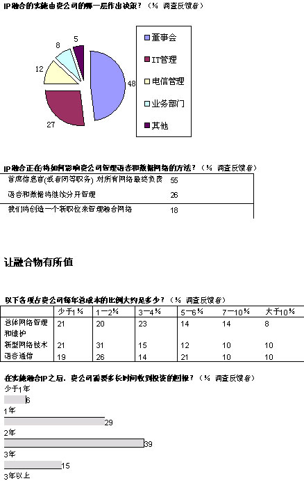 盡管如此,雖然IP融合的真正長期效益可能有利于提高員工效率,但是投資必須得到公司首席財務官的認可。在總體網絡成本中預計可以節(jié)約多少?大多數(shù)公司希望削減10%-20%的費用,也有相當一部分公司期望減少30%-40%的費用。上述報告中提到的實例中表明,這樣的節(jié)約是可以實現(xiàn)的。