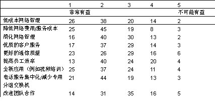 您認為融合網絡將怎樣使您的企業(yè)受益(現(xiàn)在或者將來)?請為每一項打1至5分,1表示非常有益,5表示不可能有益。(% 調查反饋者)