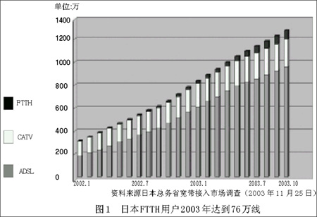 從現(xiàn)狀看,在亞洲發(fā)展FTTH比較迅速的是日本和韓國,早在20世紀(jì)90年代初期日本就制定了雄心勃勃的計(jì)劃:2010年使光纖進(jìn)入全國家庭。2001年以來,日本FTTH市場(chǎng)進(jìn)入快速增長階段:2001年只有usen和NTT東日本、NTT西日本幾家公司,而到2002年7月,已經(jīng)有9家公司提供FTTH業(yè)務(wù)。據(jù)日本總務(wù)省統(tǒng)計(jì),到2004年7月,日本FTTH用戶數(shù)已經(jīng)突破130萬,預(yù)計(jì)在2005年達(dá)到450萬。