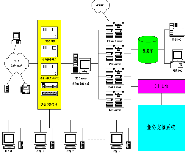 所述的電子郵件服務(wù)器(7)、交互式語音管理服務(wù)器(8)、撥號服務(wù)器(9)以及用于平均分配話務(wù)的語音系統(tǒng)分配服務(wù)器(10)均位于所述系統(tǒng)管理服務(wù)器(6)與數(shù)據(jù)庫(12)之間。所述的四個(gè)服務(wù)器(7~10)通過一個(gè)CTI業(yè)務(wù)接口(15)與業(yè)務(wù)支撐系統(tǒng)(16)連接。