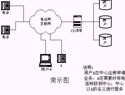 該業(yè)務(wù)方法涉及一種用戶電話轉(zhuǎn)移到CTI(Computer Telephony Integration)語音服務(wù)系統(tǒng)的接續(xù)服務(wù)方法,其CTI系統(tǒng)通過接口連接于公用電話網(wǎng),用戶在CTI系統(tǒng)登記,選擇服務(wù)功能,相關(guān)信息存入數(shù)據(jù)庫,用戶電話設(shè)置轉(zhuǎn)移;當(dāng)客戶呼叫已轉(zhuǎn)移用戶電話時(shí),自動(dòng)接入CTI語音系統(tǒng),請求相關(guān)信息,對信息進(jìn)行分析判斷、處理,查詢數(shù)據(jù)庫用戶信息,以用戶名義進(jìn)行接續(xù)服務(wù)。其完全避免了傳統(tǒng)CTI系統(tǒng)的專用特服號碼服務(wù)的弊端,充分利用了交換機(jī)的功能,以用戶的電話號碼為客戶提供語音、傳真、數(shù)據(jù)及人工接續(xù)服務(wù)。