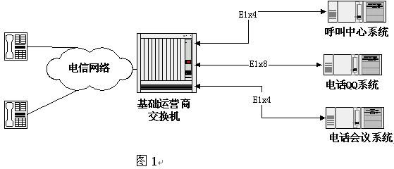 一種方式為固定分配, 即為每種語(yǔ)音系統(tǒng)分配固定數(shù)量的E1中繼,如圖1所示,這種方式的問(wèn)題主要有兩個(gè)方面:一是中繼資源沒(méi)有充分共享使用,比如在晚上,可能電話QQ業(yè)務(wù)量很大而呼叫中心很小,而白天卻正好相反。如果為每一種業(yè)務(wù)都留有很大的中繼富裕又勢(shì)必導(dǎo)致中繼資源的浪費(fèi);二是當(dāng)中繼線路來(lái)源于多個(gè)運(yùn)營(yíng)商時(shí)存在連接上的困難。