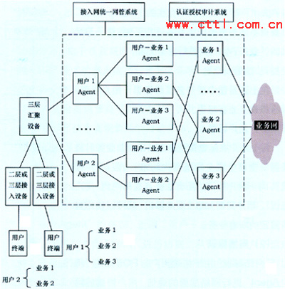 “用戶Agent”負責與用戶進行通信(用戶與用戶Agent通過IPsec加密方式通信,而用戶Agent與其它Agent則進行明碼通信),完成用戶的接入認證(與AAA系統(tǒng))、用戶網絡標識的分配、用戶業(yè)務菜單的推送、根據用戶從菜單中選擇的業(yè)務來生成“用戶-業(yè)務Agent”。還負責與“接入網統(tǒng)一網管系統(tǒng)”進行交互完成用戶選定業(yè)務的接納控制和(或)資源預留。
