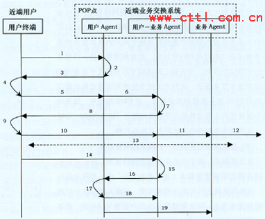 在POP點處,每類業(yè)務有一個“業(yè)務Agent”,其生命周期與運營商此類業(yè)務的生命周期相同,即從運營商開通此類業(yè)務到運營商終止提供此類業(yè)務為止,因此“業(yè)務Agent”基本上是長期存在的。“業(yè)務Agent”負責對不同用戶的同類業(yè)務進行匯聚,統(tǒng)一與遠端的“業(yè)務Agent”進行業(yè)務交互。