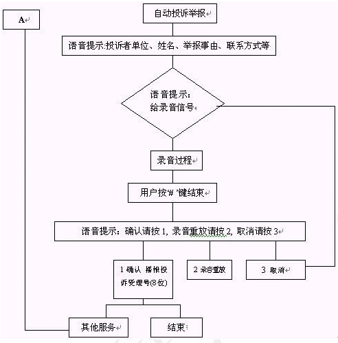 群眾通過自動臺按照語音提示進行投訴、舉報選擇錄音。自動投訴舉報錄音流程如下: