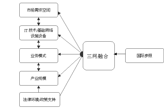 三網(wǎng)融合,需要巨大的市場需求空間、成熟的IT技術(shù)/基礎(chǔ)設(shè)施、適宜的業(yè)務(wù)模式、可觀的產(chǎn)業(yè)規(guī)模以及良好的政策支持和法律環(huán)境等必備條件的出現(xiàn)。