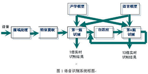 圖1所示為當(dāng)前大多數(shù)語(yǔ)音識(shí)別系統(tǒng)采用的框架和流程。原始語(yǔ)音經(jīng)前端處理后,從中提取出若干維的特征向量用于識(shí)別。識(shí)別時(shí),聲學(xué)模型和語(yǔ)言模型共同作用,得到使某一概率最大的字串作為識(shí)別結(jié)果。