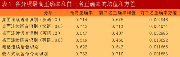 對(duì)各系統(tǒng)給出的識(shí)別結(jié)果計(jì)算上述指標(biāo),得到對(duì)各系統(tǒng)識(shí)別性能的評(píng)價(jià)。表1給出了每個(gè)分項(xiàng)中識(shí)別效果最好的系統(tǒng)的指標(biāo),以及前三名系統(tǒng)的平均指標(biāo)。為了統(tǒng)一,將電話連續(xù)語(yǔ)音識(shí)別中的槽識(shí)別正確率和嵌入式設(shè)備命令詞識(shí)別中的命令詞識(shí)別正確率統(tǒng)稱為正確率。對(duì)桌面(這里指PC,以下同)連續(xù)語(yǔ)音識(shí)別,采用文字正確率,定義為(目前研究者對(duì)文字正確率定義稍有不同,本文中一律以下面的定義為準(zhǔn)):