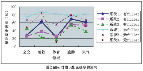 對(duì)于電話連續(xù)語(yǔ)音識(shí)別來(lái)說(shuō),由于錄制環(huán)境是辦公室真實(shí)環(huán)境,因此噪音并不是影響性能的主要因素。電話連續(xù)語(yǔ)音識(shí)別分為5個(gè)子領(lǐng)域,每個(gè)子領(lǐng)域各有一套語(yǔ)法。評(píng)測(cè)句子由語(yǔ)法生成的有效成分在前后加上任意長(zhǎng)的填充詞(filler)構(gòu)成,如語(yǔ)法生成的句子為“從天安門到中關(guān)村怎么坐公交車”,而實(shí)際錄制的句子是“你好,請(qǐng)問(wèn)從天安門到中關(guān)村怎么坐公交車,可以查到嗎?”,其中的“你好,請(qǐng)問(wèn)”和“可以查到嗎”就是filler。由分析可以發(fā)現(xiàn),不同領(lǐng)域內(nèi)的槽識(shí)別正確率相差很大。這主要有兩個(gè)原因,一是不同領(lǐng)域的語(yǔ)法復(fù)雜度不同,二是不同領(lǐng)域內(nèi)有filler的句子所占比例不同。為了進(jìn)一步衡量filler對(duì)識(shí)別的影響,選取三個(gè)識(shí)別系統(tǒng),將有filler的句子和沒(méi)有filler的句子分別計(jì)算識(shí)別率,統(tǒng)計(jì)結(jié)果如圖2所示。從圖中可以看出,filler對(duì)識(shí)別的影響是相當(dāng)大的,無(wú)filler的句子比有filler的句子識(shí)別正確率可以高幾十個(gè)百分點(diǎn)。