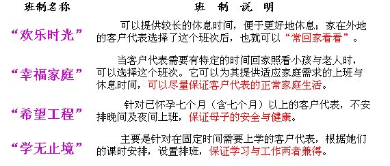 通過流程優(yōu)化,可以大大提高組織的運營效率和工作質量,如:我們通過對員工排班流程的優(yōu)化,大大提高了客戶服務中心人員的利用效率、服務質量,同時,還提高了員工滿意度。我們通過對流程中第3、4、5步工作方法的改進,大大提高了人員利用率,且提高幅度達20%以上。同樣,通過對第6步班次設置的改進,實施了個性化的班次設置(見表2),如:針對喜歡有整天休息時間,及家在外地的客戶代表,設置了“歡樂時光”輪班,為大家提供較長的休息時間,如兩天以上的連休,便于回家與更好地休息;針對家里有小孩子或老人、需在固定時間回家的客戶代表,設置了“幸福家庭”輪班,為他們提供適應家庭需求的上班與休息時間,盡量保證員工的正常家庭生活;針對已懷孕及哺乳期的客戶代表,設置了“希望工程”輪班,不安排晚間及夜間上班,保證了母子的安全與健康;針對在固定時間需要上學的客戶代表,設置了“學無止境”輪班,主要是根據(jù)她們的課時安排設置排班,保證學習與工作兩者兼得。這種做法大大加強了員工積極性,并提高了員工的滿意度。