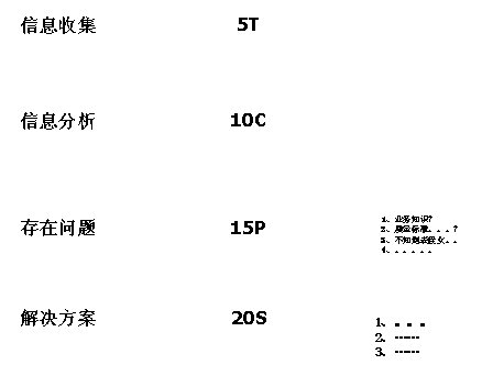 Tables)以及相應的收集方法和時間;第二步是信息分析,明確了如何將已收集的5T(5 Tables)轉換成10張圖(10 Charts)以便進一步分析;第三步是發(fā)現(xiàn)存在問題,明確了如何從10C(10