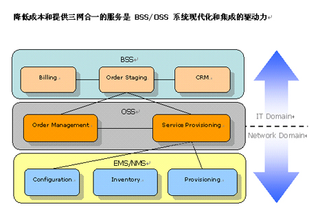 我們可以看到,集成現(xiàn)存的OSS/BSS即 NMS/EMS 是 三網(wǎng)合一的必然要求。 然而傳統(tǒng)的EAI和BPM集成產(chǎn)品是被設(shè)計成滿足IT部門集成CRM或ERP等應(yīng)用的需要,很少被用于OSS層面,原因很簡單:BSS中的系統(tǒng)多半是單一廠商提供的,只和BSS中的特定應(yīng)用打交道。然而,