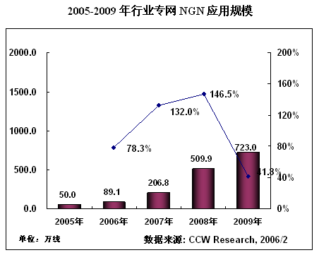 在運營商NGN建設高速增長的同時,政府、能源、交通等行業(yè)專網(wǎng)NGN建設也逐漸步入快車道。NGN在行業(yè)專網(wǎng)的應用,到2005年底的應用規(guī)模達到50萬線,根據(jù)計世資訊(CCW Research)《2005-2006中國NGN產(chǎn)業(yè)應用趨勢研究報告》的預測,未來4年,NGN在行業(yè)專網(wǎng)市場將以95%的復合增長率高速增長。