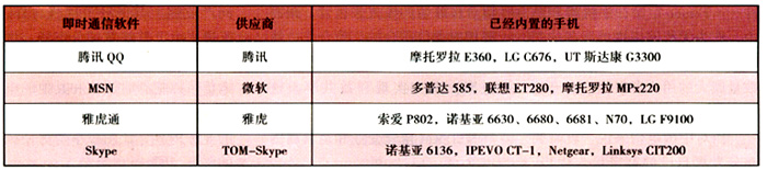 手機(jī)廠商、服務(wù)和內(nèi)容提供商都非?春靡苿(dòng)即時(shí)通信市場(chǎng),已經(jīng)有大量的手機(jī)內(nèi)置了主流的即時(shí)通信軟件,例如采用Windows Mobile系列操作系統(tǒng)的智能手機(jī)都預(yù)置了MSN。雅虎、騰訊在推動(dòng)其“移動(dòng)QQ”業(yè)務(wù)時(shí),也努力說服手機(jī)廠商內(nèi)置其軟件。內(nèi)置即時(shí)通信軟件的手機(jī)型號(hào)如表l所示。