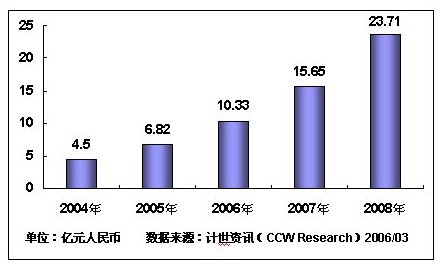 我國(guó)移動(dòng)電子政務(wù)已經(jīng)進(jìn)入高速發(fā)展時(shí)期:2005年的市場(chǎng)規(guī)模達(dá)6.82億元,增長(zhǎng)率為51.6%;2006年將達(dá)到10.33億元。預(yù)計(jì)未來(lái)三年內(nèi),我國(guó)移動(dòng)電子政務(wù)復(fù)合增長(zhǎng)率將達(dá)到51.5%,截至2008年,市場(chǎng)規(guī)模將突破20億元。