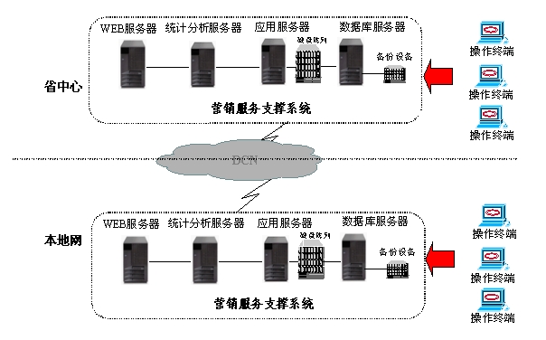 省中心/分公司營銷服務(wù)支撐系統(tǒng)由兩臺IBM服務(wù)器形成雙機集群,同時安裝有數(shù)據(jù)庫服務(wù)器、WEB服務(wù)器、應(yīng)用服務(wù)器、統(tǒng)計分析服務(wù)器。