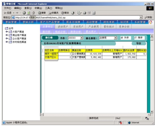 本系統(tǒng)是以市場為導(dǎo)向、客戶為中心、效益為目標(biāo)的電信營銷和服務(wù)的支撐系統(tǒng),為企業(yè)經(jīng)營服務(wù)和營銷戰(zhàn)略提供有力的支撐,通過對業(yè)務(wù)收入、業(yè)務(wù)發(fā)展以及市場競爭的深入分析,從而達到留住老客戶、發(fā)現(xiàn)新客戶,了解競爭對手動態(tài),及時掌握市場變化趨勢的目的。