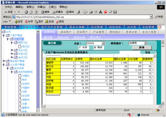 本系統(tǒng)通過對本地計費帳務(wù)系統(tǒng)、網(wǎng)間結(jié)算系統(tǒng)、1000號客戶服務(wù)系統(tǒng)、“九七工程”系統(tǒng)、資源管理系統(tǒng)的動態(tài)相關(guān)數(shù)據(jù)的提取,按日(天)記錄并分析開展?fàn)I銷服務(wù)工作所需的客戶基本資料、客戶關(guān)系資料、客戶收入信息、客戶消費行為信息、客戶變動信息、客戶障礙信息、客戶投訴信息、客戶競爭動態(tài)信息等支撐信息,指導(dǎo)各類客戶經(jīng)理開展有針對性營銷服務(wù)工作。