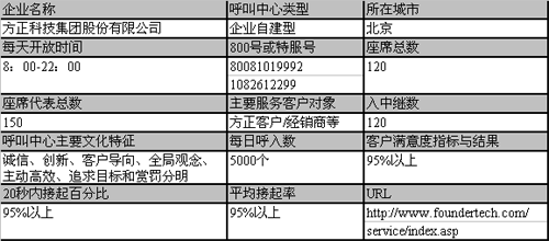 方正呼叫中心是方正服務(wù)平臺(tái)的重要組成部分,1999年建立,秉承了北大方正“勤備、嚴(yán)謹(jǐn)、求實(shí)、創(chuàng)新”的精神,依托方正科技“誠信、創(chuàng)新、客戶導(dǎo)向、全局觀念、主動(dòng)高效、追求目標(biāo)和賞罰分明”的核心價(jià)值觀,以及“全程服務(wù)”的品牌文化,以“優(yōu)化服務(wù)流程,提高服務(wù)質(zhì)量,培育優(yōu)秀品牌,形成競爭優(yōu)勢,創(chuàng)新服務(wù)模式,加速業(yè)務(wù)增長”作為自己的發(fā)展目標(biāo)和方向,并學(xué)習(xí)業(yè)界先進(jìn)的理念和方法,不斷探索和發(fā)展,多次受到媒體和機(jī)構(gòu)的關(guān)注。