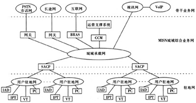 目前,中國聯(lián)通已建立了覆蓋全國的成熟的VoIP網(wǎng)、視訊網(wǎng)和互聯(lián)網(wǎng)等骨干業(yè)務(wù)網(wǎng)。為了突破在本地網(wǎng)內(nèi)開展業(yè)務(wù)的瓶頸,我們在城域范圍內(nèi)建設(shè)了城域綜合業(yè)務(wù)網(wǎng)(MISN,MetropolitanIntegratedServiceNetwork)。它以現(xiàn)有的城域承載網(wǎng)為基礎(chǔ),通過先進(jìn)統(tǒng)一的業(yè)務(wù)和網(wǎng)絡(luò)平臺,在城域范圍內(nèi)實現(xiàn)語音、視頻和因特網(wǎng)等各種業(yè)務(wù)的綜合,將各種業(yè)務(wù)從骨干網(wǎng)向用戶側(cè)延伸。