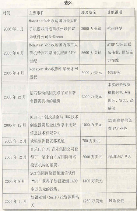 近幾年來(lái),一些資本投資商將投資的重點(diǎn)放到了無(wú)線音樂(lè)、手機(jī)游戲和手機(jī)視訊等業(yè)務(wù)領(lǐng)域,逐步加大了對(duì)SP的投資力度(見(jiàn)表3)。進(jìn)入2005年以來(lái),著眼于2.5G向3G的全面演進(jìn),風(fēng)險(xiǎn)投資對(duì)SP的投資力度進(jìn)一步加大。以滾石移動(dòng)為例,在2002年和2004年獲得兩輪風(fēng)險(xiǎn)投資之后,滾石移動(dòng)憑借在無(wú)線音樂(lè)領(lǐng)域取得的良好市場(chǎng)業(yè)績(jī),又獲得了智基創(chuàng)投、華登國(guó)際、聯(lián)想投資等公司的投資,投資金額達(dá)3000萬(wàn)美元。繼2004年10月獲得IDG投資以后,2005年12月7日,國(guó)內(nèi)著名的數(shù)字音樂(lè)門戶——A8音樂(lè)集團(tuán)獲得了包括IDG和Intel投資公司在內(nèi)的5家國(guó)際著名投資機(jī)構(gòu)的投資,投資金額達(dá)2000萬(wàn)美元。同月,掌中無(wú)限則獲得了來(lái)自全球性風(fēng)險(xiǎn)投資商BlueRun創(chuàng)投基金和IDG總額達(dá)上千萬(wàn)美元的投資。