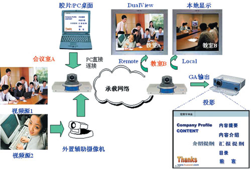 會(huì)議中常常需要同時(shí)傳送演講人的演講膠片和演講人的圖像,這套視訊系統(tǒng)非常方便地支持此功能,只需要把演講人的便攜機(jī)用線纜接到會(huì)場(chǎng)的終端上,通過(guò)終端的SXGA輸入功能可方便地將膠片信息發(fā)送到遠(yuǎn)端會(huì)場(chǎng),遠(yuǎn)端會(huì)場(chǎng)通過(guò)終端的SXGA輸出接口將膠片內(nèi)容通過(guò)投影設(shè)備顯示出來(lái),而終端的主視頻輸出接口顯示的是遠(yuǎn)端演講人的圖像。