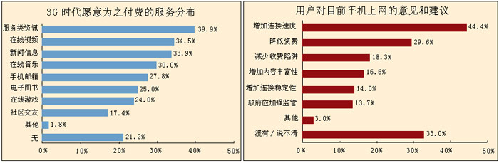 目前用戶對手機(jī)上網(wǎng)的意見主要集中在速度和資費(fèi)方面,要求增加速度的比例超過了所有用戶的4成,降低資費(fèi)和減少收費(fèi)陷阱的比例分別為29.6%和18.3%。