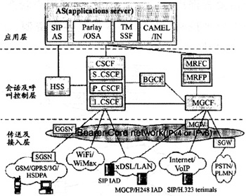 一般IMS分為三層,應(yīng)用層支持各類應(yīng)用服務(wù)器,負(fù)責(zé)為用戶提供增值業(yè)務(wù)和第三方業(yè)務(wù)。會話及呼叫控制層負(fù)責(zé)管理呼叫或會話設(shè)置,其中呼叫會話控制模塊CSCF完成呼叫網(wǎng)關(guān)功能、呼叫業(yè)務(wù)觸發(fā)功能和路由選擇功能,將SIP信令消息正確地轉(zhuǎn)發(fā)到應(yīng)用服務(wù)器。歸屬用戶服務(wù)器HSS用于維護(hù)每個終端用戶獨(dú)有的業(yè)務(wù)屬性,包括IP地址、漫游信息、好友列表、呼叫業(yè)務(wù)定制信息及語音郵件設(shè)置等。HSS是全網(wǎng)可用資源。媒體資源功能MRF包括MRFP和MRFC,負(fù)責(zé)提供及控制媒體流資源,如播放通知音、媒體流的混合、編解碼等。媒體網(wǎng)關(guān)控制MGCF負(fù)責(zé)PSTN承載與IP流之間的連接,根據(jù)被叫號碼和來話情況選擇CSCF,并完成PSTN與IMS之間的呼叫控制協(xié)議轉(zhuǎn)換,如將從CSCF接收到的SIP消息轉(zhuǎn)換為MEGACO或ISUP消息,并通過IP發(fā)送到信令網(wǎng)關(guān)SGW。出口網(wǎng)關(guān)控制功能BGCF主要實(shí)現(xiàn)呼叫路由功能,為呼叫選擇適當(dāng)?shù)腜STN接口點(diǎn),若發(fā)現(xiàn)該接口點(diǎn)與自己在同一網(wǎng)絡(luò),則選擇本網(wǎng)絡(luò)的MGCF與PSTN交互,若發(fā)現(xiàn)接口點(diǎn)在另一網(wǎng)絡(luò)時,BGCF將會話信令轉(zhuǎn)發(fā)給另一網(wǎng)絡(luò)相應(yīng)的BGCF。一個IMS可以包含一個或多個CSCF、HSS、MGCF等功能模塊。傳送及接入層承載各種類型之間的轉(zhuǎn)換,完成與傳統(tǒng)PSTN/PLMN間的互通等功能,包括各類有線接入、無線接入、互聯(lián)互通網(wǎng)關(guān)等設(shè)備。