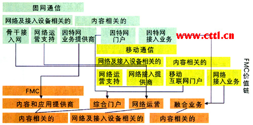總之,在FMC新配置的價值鏈中,應用和內容的作用非常重要,因為他們在融合時將價值鏈中的各個部分連接起來。因此,可以認為內容和應用的建立、積累將會推動增值FMC業(yè)務的發(fā)展。今后隨著在內容和業(yè)務領域將出現(xiàn)更多不同的參與者,如內容提供商、應用提供商和中間件提供商,F(xiàn)MC價值鏈將進一步得到更深層次的合作、擴張和合并。這些在新的價值鏈中出現(xiàn)的更多獨立但又不同的實體,將直接反映FMC融合的特征。