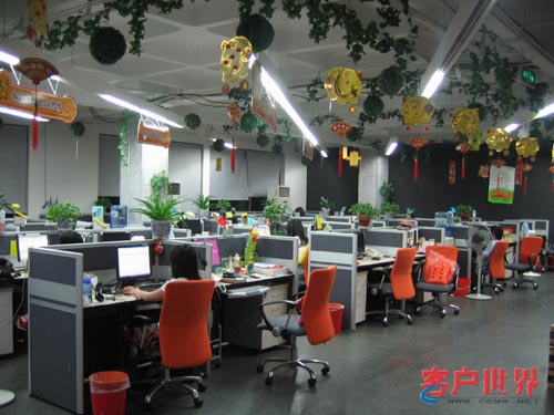 整個服務(wù)現(xiàn)場的裝修以桔黃色為主色調(diào),代表溫暖、和諧;格局不規(guī)則化,盡顯現(xiàn)代時尚的風(fēng)格;辦公室到處是綠色植物,墻上貼滿了各種相片、海報和宣傳語,天花板掛滿了激勵口號板;別具特色的洗手間文化;乒乓球室、休息室、休閑吧,咖啡機、茶葉、果汁、雪糕、飲料,魚缸、大液晶電視、音響……一點感覺不到這是一個枯燥的呼叫中心的工作環(huán)境。