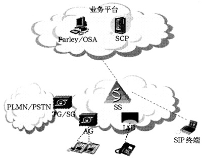 直接由SoftSwitch提供業(yè)務(wù),可提供基本電話業(yè)務(wù)、補充業(yè)務(wù)等;SoftSwitch具備SSP功能,通過SG與現(xiàn)網(wǎng)SCP互通,提供現(xiàn)有智能網(wǎng)業(yè)務(wù);SoftSwitch與應(yīng)用服務(wù)器之間通過SIP、H.323、Radius等協(xié)議互通;通過Parlay-GW/OSA-GW提供API接口,為第三方提供業(yè)務(wù)開發(fā)平臺。